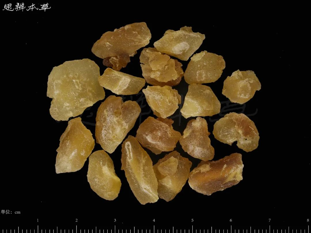 天门冬半透明角质样,,具黏性,,,表面可见方块状糖结晶形成的白霜。。。。天门冬通常黏性强,,,但在较为干燥的情况下黏性下降,,,同时析出白霜。。。